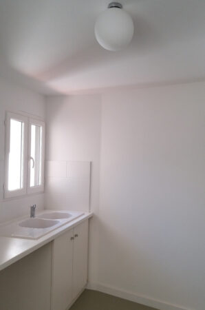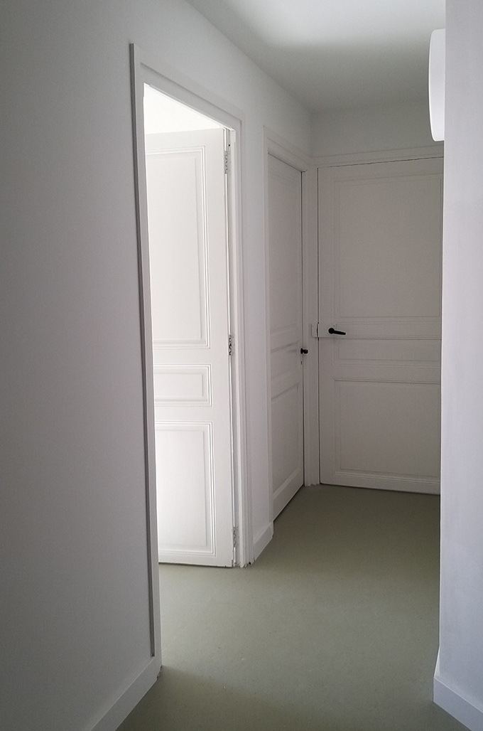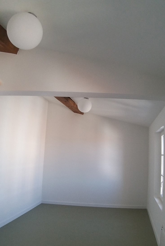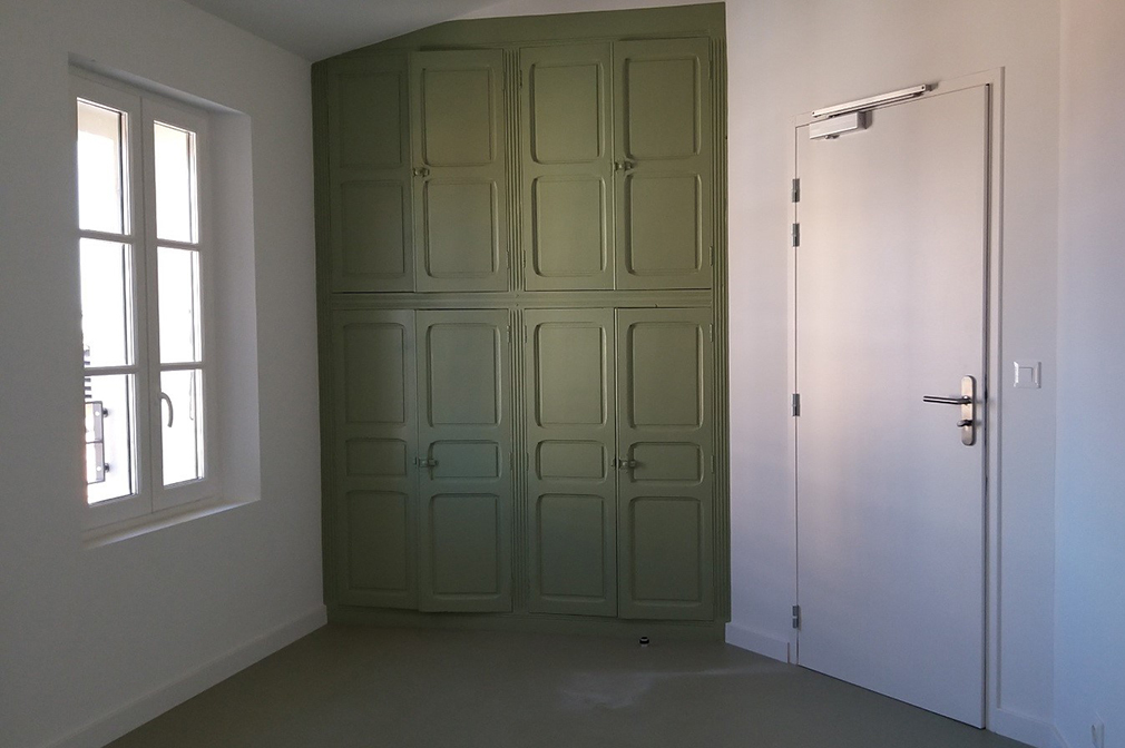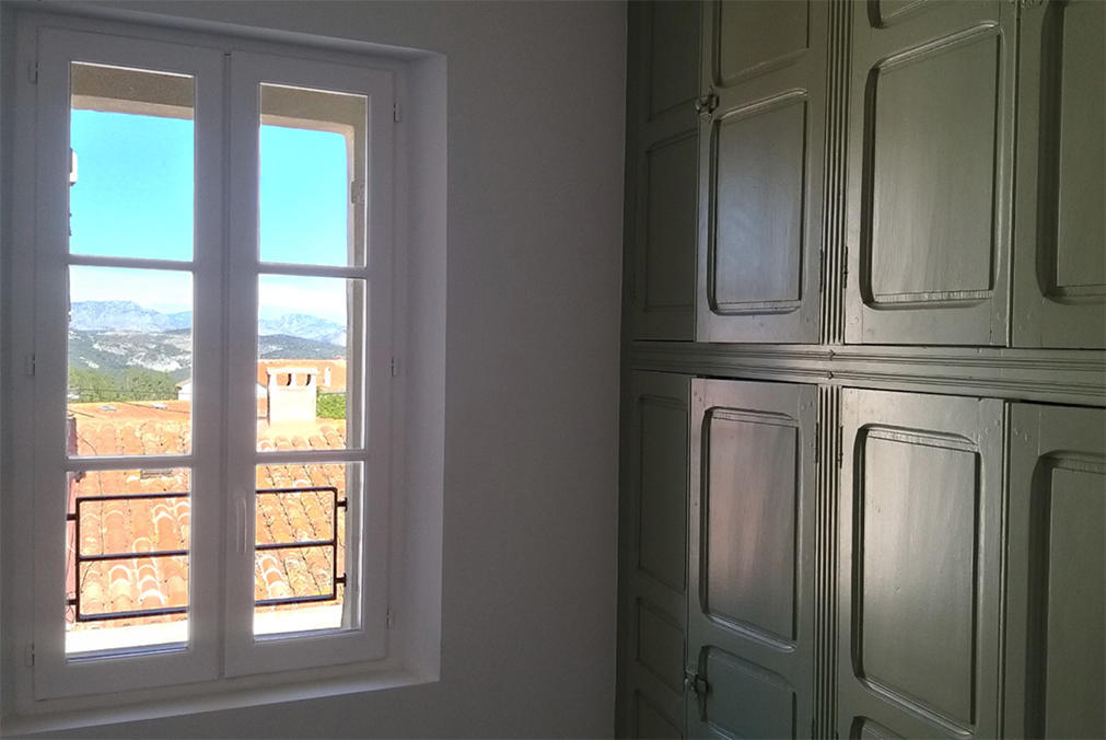 Le projet cherche à préserver au maximum les matériaux et équipements en place : volets bois restaurés, menuiseries bois refaites à l’identique avec un double vitrage, toiture refaite à l’identique avec isolation en sous-face, reprises de la majorité des murs et plafond au plâtre.